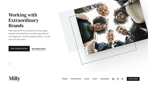 The Milly child theme includes over 30 custom, pixel-perfect pages designed to meet your every need. Whether you want to build a sleek, professional brand image, gain new subscribers or clients, Milly’s got what you need. Take a look!